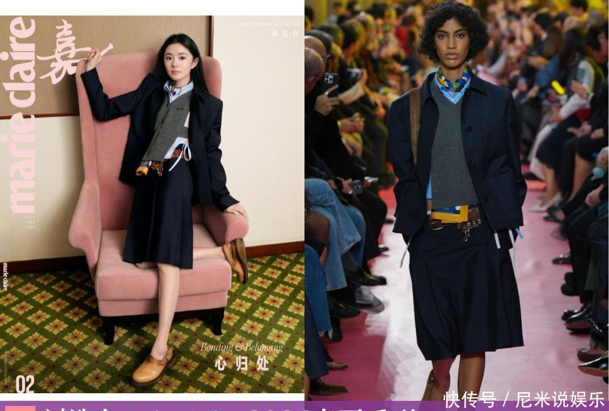 刘浩存,《嘉人》2026年2月刊。藏青色夹克、半身裙:Miu Miu 2026春夏系列。