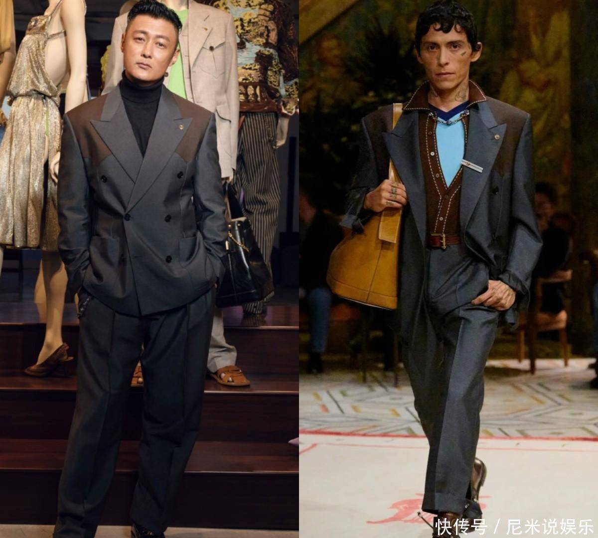 余文乐,品牌活动。深灰色拼接双排扣西服套装:Versace 2026春夏系列。Versace:意大利品牌,Gianni Versace和Santo Versace创立于1978年。