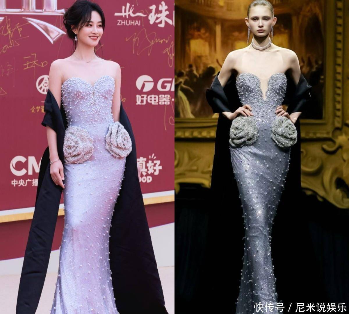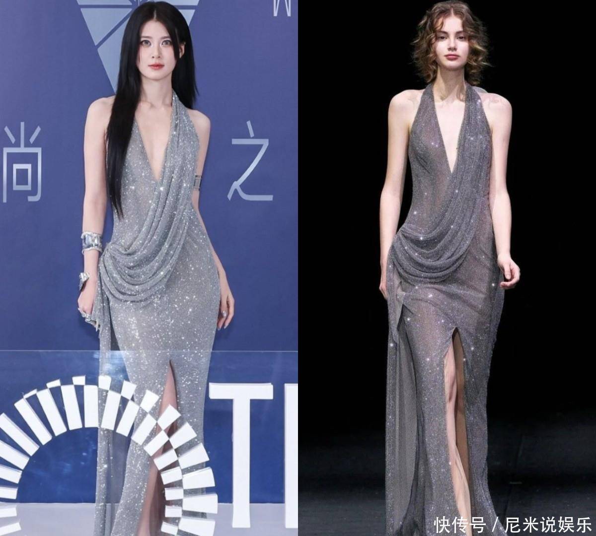 赵昭仪,时尚32周年时尚之夜。灰色亮片垂坠深V挂脖礼服:XI PALETTE 2026春夏系列。XI PALETTE:Wang Feng旗下品牌。