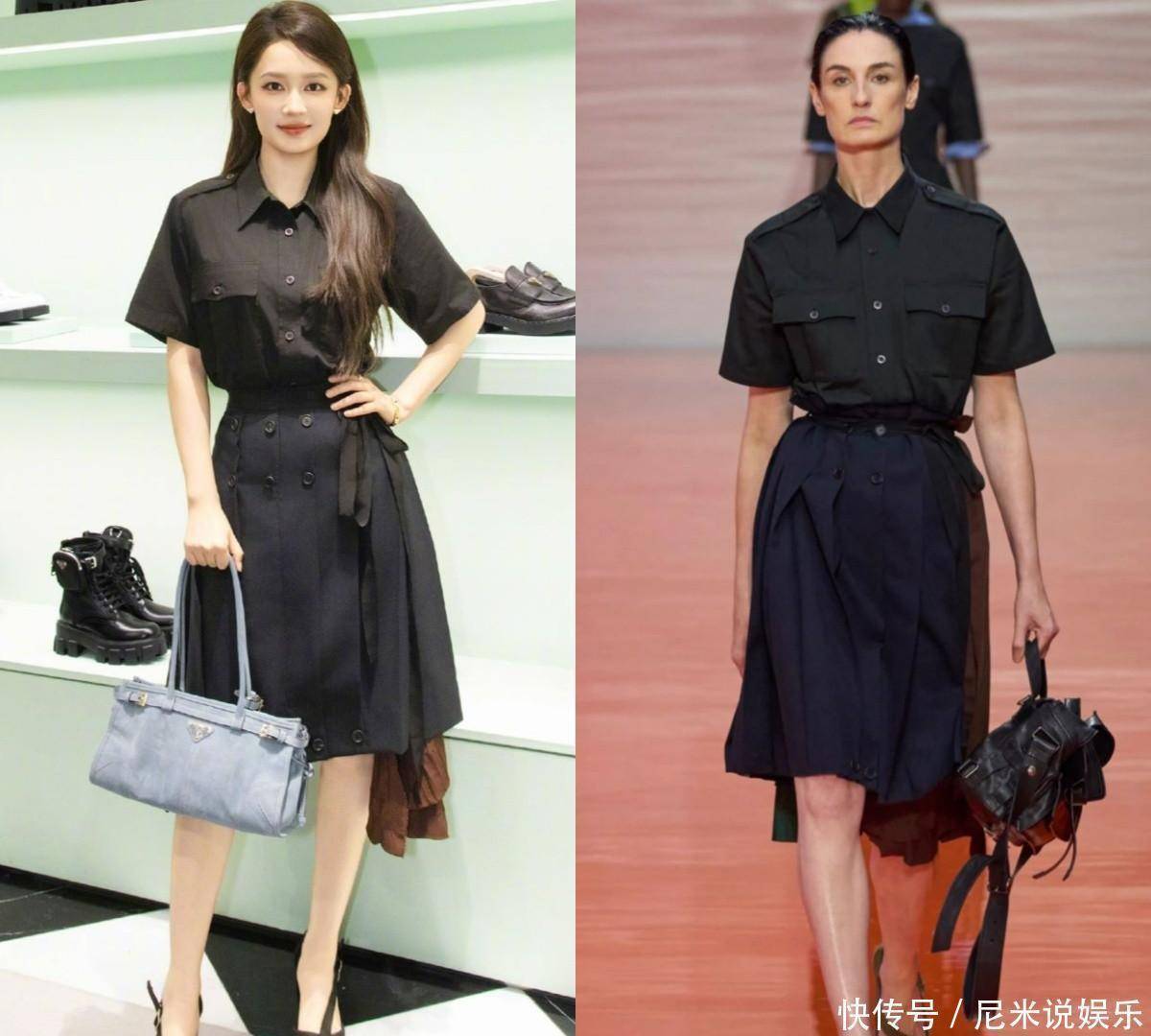 李沁,品牌活动。黑色短袖衬衣、深蓝色半身裙:Prada 2026春夏系列。Prada:意大利品牌,Mario Prada于1913年在米兰创建。