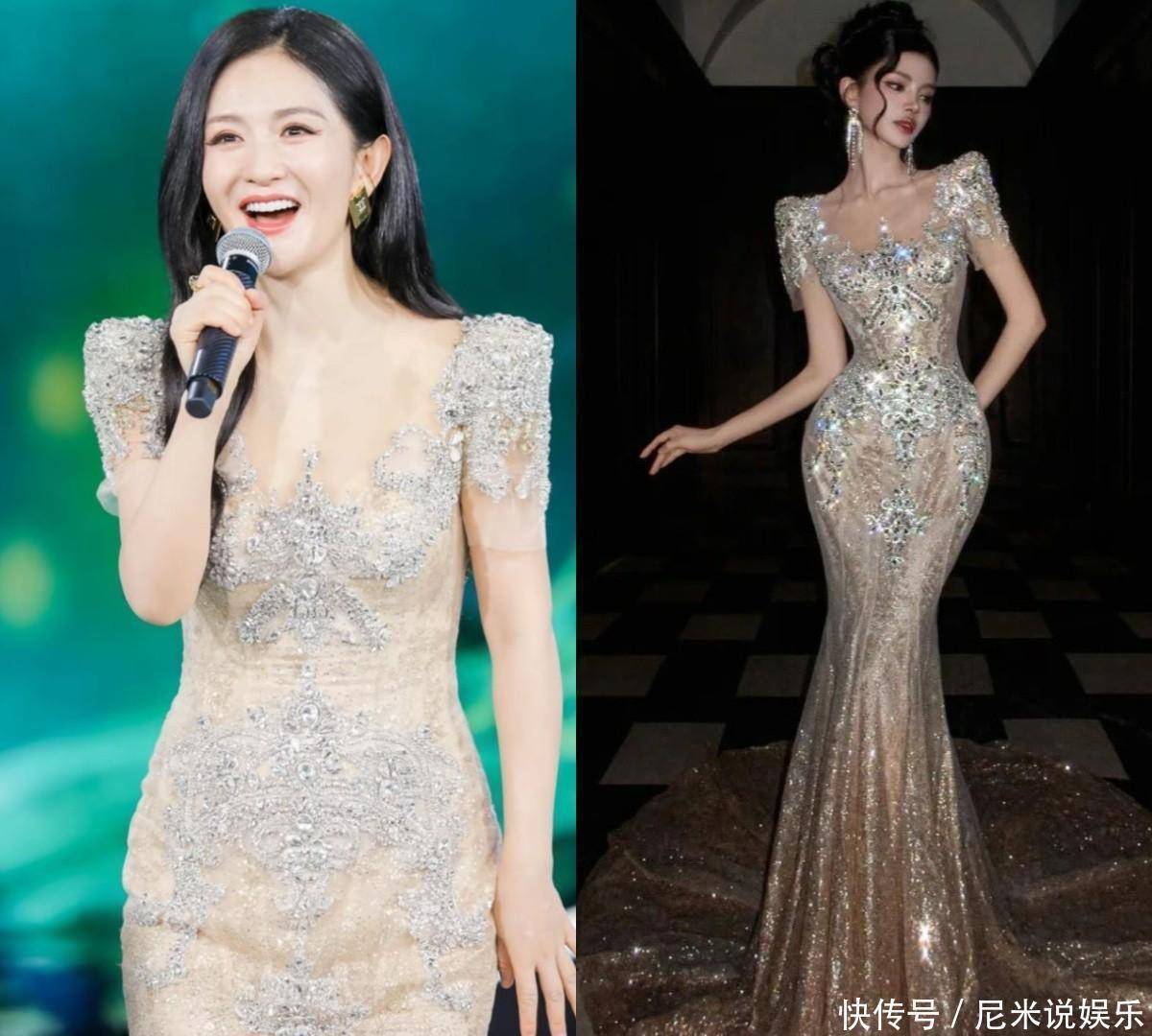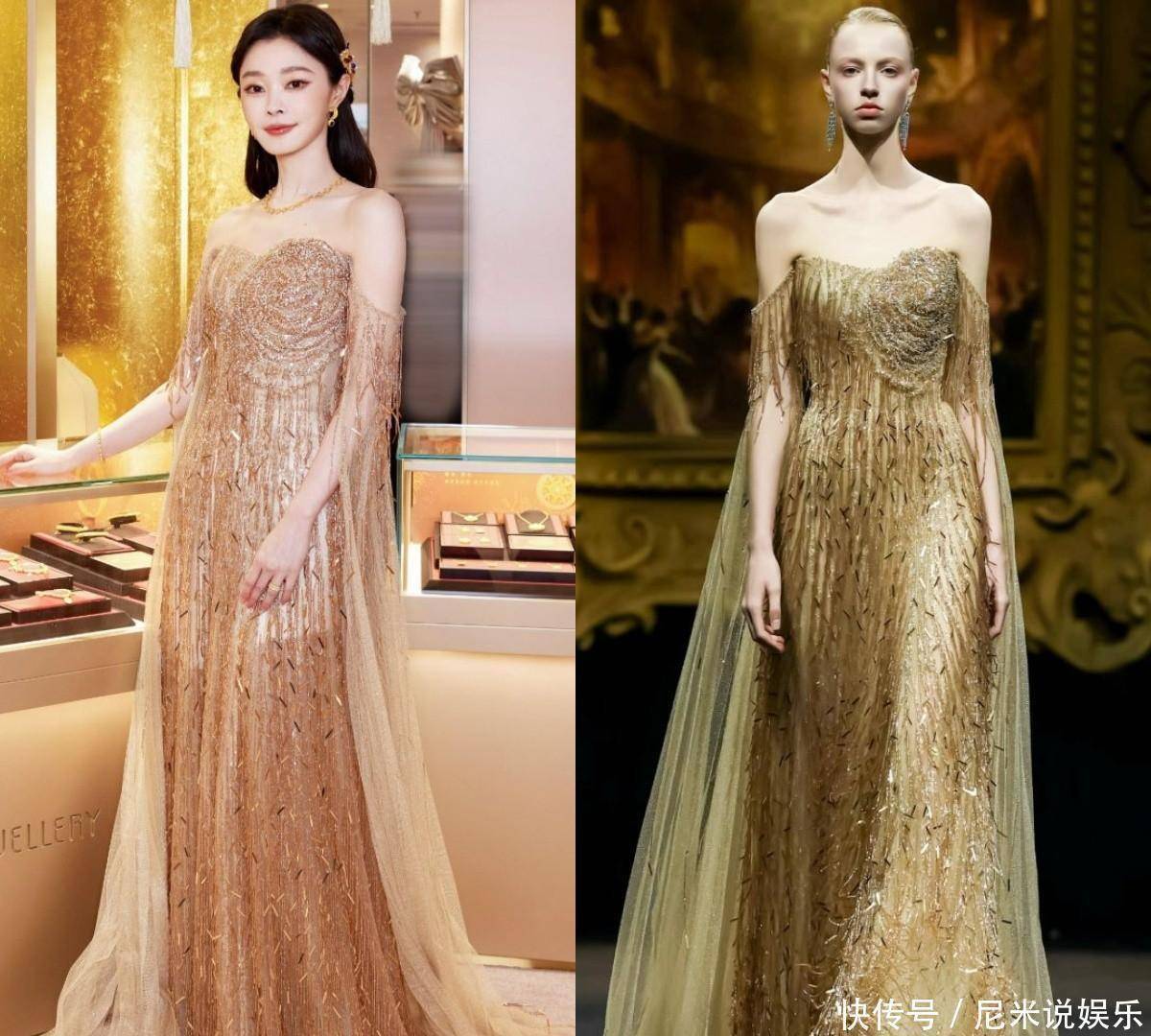 宋轶,潮宏基合肥活动。金色钉珠亮片抹胸礼服:Ivan Yong 2026春夏系列。