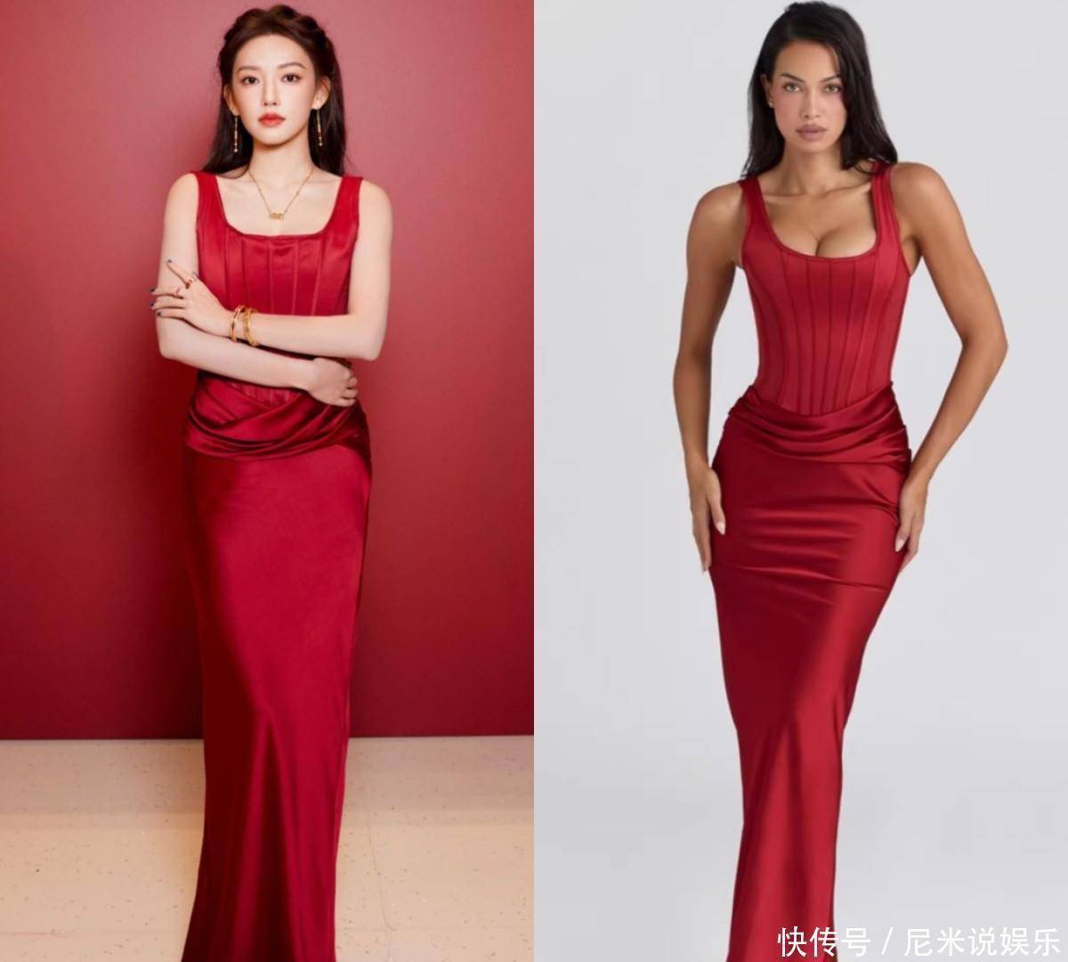 程潇,品牌活动。红色缎面抽褶连衣裙:House of CB。House of CB:英国品牌。